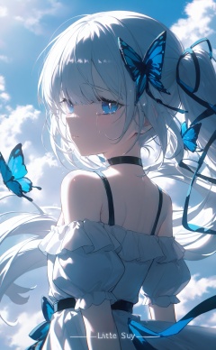 masterpiece,very aware,highres,absurdres,newest,best quality,loli,petite,high quality,chromatic_aberration,//,High quality 8k,1girl, solo, long hair, looking at viewer, blush, bangs, blue eyes, hair ornament, dress, ribbon, bare shoulders, closed mouth, hair ribbon, ponytail, white hair, frills, sky, choker, puffy sleeves, looking back, cloud, tears, off shoulder, white dress, english text, floating hair, crying, bug, butterfly, crying with eyes open, blue theme, off-shoulder dress, butterfly hair ornament, blue butterfly//,<lora:konya_karasue——【noob】hans:0.8>,