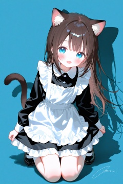 1girl,:d,animal ear fluff,animal ears,apron,black footwear,blue background,blue eyes,brown hair,cat ears,cat girl,cat tail,dot nose,dress,frilled apron,frilled dress,frills,kneeling,looking at viewer,maid,maid apron,open mouth,shadow,short dress,signature,simple background,smile,socks,solo,tail,watermark,white socks,