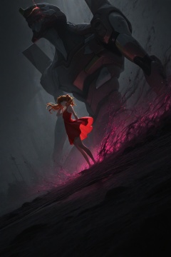 HDR,8K,high contrast,masterpiece,best quality,amazing quality,very aesthetic,superabsurd res,high resolution,ultra-detailed,absurdres,newest,scenery,light rays,chiaroscuro,dynamic angle,score_9,score_8_up,score_7_up,atic aberration,anaglyph,unstable coloring,partially colored,surrounded by floating data streams,fragmented code,dark aura,(ushiki yoshitaka style:0.5),dynamic,from side,foreshortening,souryuu asuka langley in red sundress,((eva 02 in view)),hair flip,wind,twintails,
