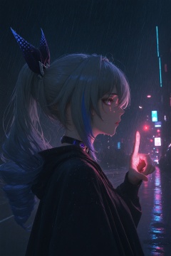 masterpiece,best quality,amazing quality,very aesthetic,absurdres,newest,highres,nixeu:0.5,yoneyama mai:0.5,1girl,solo,silver wolf \(honkai: star rail\),honkai \(series\),cyberpunk,street,night,darkness,metallic texture,from side,ray tracing,pointing to you,rain drops on the girl,strong color performance,oil painting style,