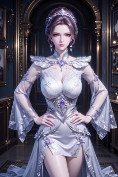 The image depicts a highly detailed and stylized digital artwork of a female character. She is standing confidently with her hands on her hips, wearing an elegant white dress adorned with intricate silver patterns and designs. The dress features a high collar and long sleeves, with delicate lace and floral embellishments. Her hair is styled in an updo, adorned with a silver tiara that matches the overall theme of the outfit. The background consists of dark, ornate walls with framed pictures, adding a sense of sophistication and depth to the scene. The lighting is soft and highlights the character's features, creating a striking contrast with the darker surroundings.