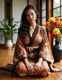 Stable_Yogis_Illustrious_Positives 1girl, solo, long hair, looking at viewer, brown hair, black hair, long sleeves, closed mouth, jewelry, sitting, brown eyes, collarbone, flower, earrings, japanese clothes, day, indoors, wide sleeves, kimono, black eyes, lips, head tilt, wavy hair, ring, plant, red flower, robe, yellow flower, wooden floor, on floor, realistic, potted plant, vase, orange flower, flower pot, brown kimono, asian, photorealistic