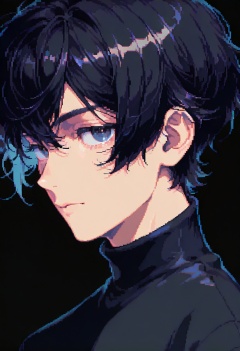 dpa,pixel art, solo, 1boy, male focus, black hair, black background, closed mouth, looking at viewer, profile, turtleneck, short hair, simple background, portrait