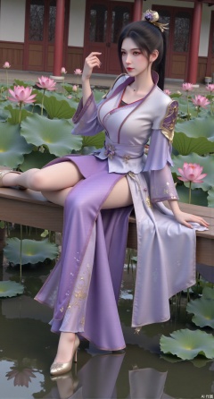 (masterpiece:1.2),best quality,,(UE5.5,rendered with Unreal Engine 5,Unreal Engine 5,CG rendering:1.1),The image is a digital illustration of a young woman sitting on a wooden bench in a pond with lily pads. She is wearing a long dress with design on the chest and sleeves. The dress has a high neckline and short sleeves,Holding a lotus in hand. She has long dark hair styled in loose waves and is wearing gold high heels. The woman is posing with one hand on her hip and the other resting on the edge of the bench. The background is filled with pink and white lotus flowers and green leaves. The overall mood of the image is peaceful and serene,(huge breasts:2.99),(full breasts:2.99),(Background with traditional Chinese architecture, lotus pond and pink lotus flowers:1.39),,Xmupeiling,XsongyuYK,XqiyueFHK,XheguangzhefandiYK,XxiaobaiNZYK,XlimuwanJCBYK,XmeijiK,XzhouruK,Xjinniang,Xliangpianqun,Xyinggou,Xfeitianwunv,XnangongxierK