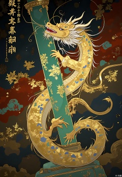 A celestial dragon coils around a jade pillar, its scales rendered in shimmering gold foil mosaic patterns. The atmosphere pulses with vermilion mineral gradients and floating oracle bone script characters.