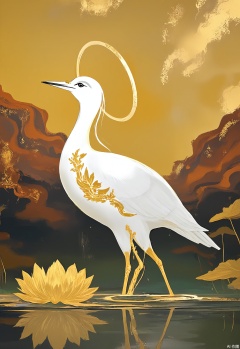 JBYC, A lotus pond at dawn features a solitary white heron wading through gold-flecked waters, its reflection mirrored in a circular halo of molten copper tones. Delicate gold foil veins trace the lotus leaves.