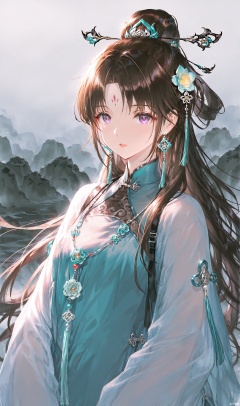 1girl, solo, long hair, looking at viewer, brown hair, hair ornament, long sleeves, dress, jewelry, purple eyes, upper body, ponytail, flower, earrings, hair flower, facial mark, chinese clothes, forehead mark
