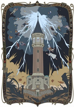 OKLP, A digital illustration of a "Tower" - inspired tarot scene, showing a tall tower being struck by lightning. People are falling from the tower. They are enclosed in a frame with storm - related and destructive patterns. The tower is made of stone with a pointed roof. The people are in mid - air, their clothes fluttering. The background is a complex tarot - style pattern of dark clouds, thunderbolts, and rubble. The artwork has a detailed, semi - realistic style with bold, contrasting colors and dramatic shading, symbolizing sudden change and upheaval.