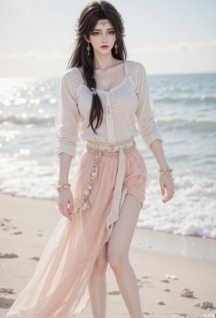 The 20-year-old girl is wearing a moon-white linen blouse, with a light pink tulle slit skirt on the outside, the hem is covered with shells and pearl chains, and straw-woven fish bone waist chains are tied around her waist. The ebony long black hair is braided into a fishbone braid and droops to the waist, the end of the hair is wrapped in starfish-shaped resin hairpins, and the earrings are hollowed out in coral branches. She stepped barefoot on the beach to pick up shells, and the tidal halo penetrated the tulle and refracted soft light on the linen fabric.