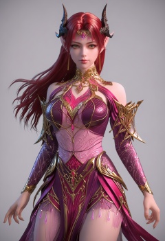 score_9,high detail,best quality,shiny skin,shiny,yaoyexun,1girl,solo,yellow eyes,red hair,long hair,jewelry,white background,pointy ears,horns,earrings,simple background,bare shoulders,breasts,dress,lips,closed mouth,armor,barefoot,realistic,looking at viewer,cowboy shot,thighs,<lora:QQSponyyaoyexunV1:0.8>,<lora:Pony_DetailV2.0:0.8>,<lora:皮肤凹痕:0.1>,