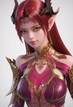 score_9,high detail,best quality,shiny skin,shiny,yaoyexun,1girl,solo,yellow eyes,red hair,long hair,jewelry,white background,pointy ears,horns,earrings,simple background,bare shoulders,breasts,dress,lips,closed mouth,armor,barefoot,realistic,looking at viewer,upper body,<lora:QQSponyyaoyexunV1:0.8>,<lora:Pony_DetailV2.0:0.8>,<lora:皮肤凹痕:0.1>,