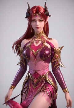 score_9,high detail,best quality,shiny skin,shiny,yaoyexun,1girl,solo,yellow eyes,red hair,long hair,jewelry,white background,pointy ears,horns,earrings,simple background,bare shoulders,breasts,dress,lips,closed mouth,armor,realistic,looking at viewer,thighs,<lora:QQSponyyaoyexunV1:0.8>,<lora:Pony_DetailV2.0:0.8>,<lora:皮肤凹痕:0.1>,
