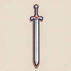 MBDJ, A digital drawing of a shiny silver sword with a jeweled hilt, placed on a plain white surface. The blade has a slight curve and is etched with mystical symbols. The hilt features a large, red gemstone at the pommel. The style is cartoonish and detailed, with clean outlines and a touch of metallic sheen. A shadow casts from the sword, indicating a light from above.