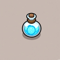 MBDJ, A digital drawing of a potion bottle with a cork stopper and a label reading "Invisibility", sitting on a plain white shelf. The liquid inside is a swirling, silver color. The bottle has small bubbles rising to the surface. The style is cartoony and mysterious, with clean lines and a subtle glow effect. A shadow under the bottle suggests a light from above.