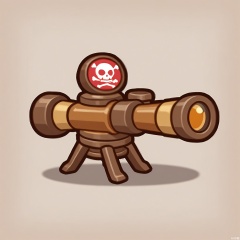 MBDJ, A digital drawing of a pirate's telescope with a brass body and a leather grip, leaning against a plain white wall. The telescope has a small, magnifying lens at one end and is decorated with a skull and crossbones emblem. The style is cartoony and adventurous, with detailed textures and a warm color palette. A shadow casts from the telescope, indicating the light's direction.