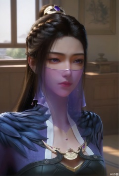 1girl, solo, long hair, brown hair, black hair, hair ornament, dress, jewelry, closed mouth, purple eyes, upper body, indoors, necklace, lips, see-through, looking to the side, looking at view, expressionless, portrait, veil, mouth veil