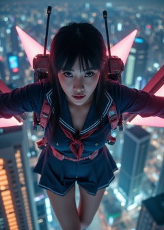Ultra-realistic Japanese high school girl (JK), cute and slightly sexy, wearing a stylish modified school uniform, fierce demon-like expression, part-cybernetic body, with high-tech mechanical wings and advanced sci-fi weapons attached to her arms and back, glowing mechanical parts, realistic skin textures, flying high above a futuristic cyberpunk city at night, surrounded by neon lights, illuminated skyscrapers, light reflections on glass buildings, cinematic lighting, highly detailed, sharp focus, 8K resolution, photorealism, epic and dramatic atmosphere"