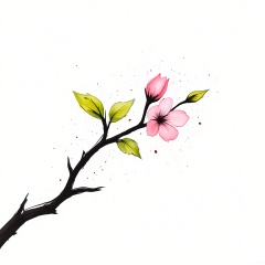 PMSC, A delicate, Chinese ink-wash watercolor of a cherry blossom branch in spring, in a soft pink and white color scheme with subtle green accents. The cherry blossoms are rendered with gentle, blooming strokes, symbolizing beauty and renewal. The white background highlights the branch's elegance and fragility, creating a serene and romantic scene.