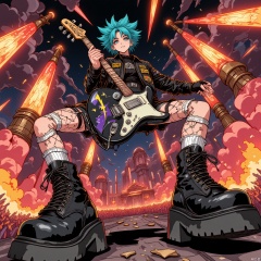 Wide-angle perspective, DTS, A dynamic, low-angle illustration of a character with turquoise hair in a wild, mohawk style, wearing a leather jacket with patches of rock bands, ripped fishnet stockings, and combat boots with spikes. The character is strumming an electric guitar with a lightning bolt design, headbanging as they look towards the viewer with a rebellious glare. The background features a rock concert stage with pyrotechnics, a mosh pit of fans, and a dark, smoky sky with red and orange flames. The style is reminiscent of a comic book or graphic novel, with bold, energetic lines and a fiery, rock 'n' roll color scheme.