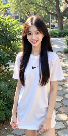 This photo is of a young Asian woman standing outdoors in a sunny residential area. She has long straight hair hanging over her shoulders, smiling warmly at the camera. She is wearing a white T-shirt with the Nike logo on the front, and holding the hem of the shirt with her left hand. This woman has fair skin and a slim figure.