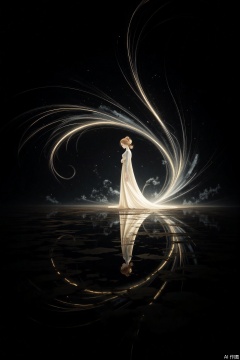 In the dark world, a light - haired woman stands. Light trails wind like memory threads. She lowers her eyes, her figure gently wrapped by light and shadow, with the reflection elongating loneliness. In the interweaving of light and shadow, her silent emotions towards the world are hidden, quiet and profound...jzbj,Mirror-reflective Background,Ink Wash Painting