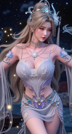 (masterpiece, best quality:1.2), A graceful goddess with cascading, golden hair that sparkles with tiny stars. She is dressed in a glittering, pearl-white hanfu, the hem decorated with falling stars and glowing constellations. She dances lightly in the starry night sky, surrounded by a shower of glowing stardust. Vivid, iridescent colors, dynamic movement, cosmic atmosphere, high contrast.(huge breasts:2.99), (full breasts:2.99),Xqianqianmeinu,Xmoxionghanfu,Xleisiqipao,Xxeushengxiaofu,Xxiajixiaofu,Xzileisiqipao,XluxueqiXY2,Xyaoyuexianzi