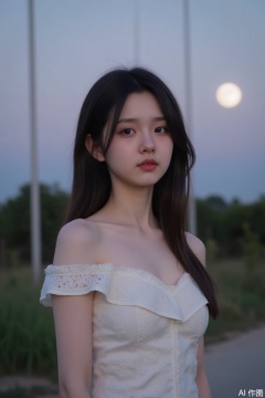 The image shows a young woman standing outdoors during what appears to be dusk or dawn. She is wearing a white, off-shoulder top with intricate lace detailing. Her hair is long and slightly wavy, cascading over her shoulders. The background is softly blurred, featuring a few tall poles and some greenery, with a bright, full moon visible in the sky, creating a serene and tranquil atmosphere.
