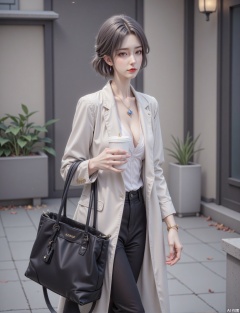 A 28-year-old working woman has neat short hair and slightly curled hair, with a low-key gray-purple ending. The makeup is exquisite and capable, the light brown eye shadow is naturally smudged, the slender eyeliner is paired with clear eyelashes, and the bean paste-colored matte lipstick adds an elegant temperament. She is wearing an off-white loose blazer, with smooth shoulder lines and a black slim suspender inside, revealing her delicate collarbone. The bottom is black high-waisted straight-leg trousers, with nine-quarter length, paired with white pointed high heels, the heel height is moderate for easy walking. A simple silver thin chain is worn between the neck, and the pendant is designed in a geometric diamond shape; a leather strap and a thin metal bracelet are stacked on the wrist to show the fashionable feeling of the workplace. She was carrying a black leather tote bag with one hand, and a cute bear hanging hanging on it, adding a touch of playfulness to the overall look. She held a coffee cup in the other hand, with a hurry and confident eyes, showing the ability and elegance of modern working women.