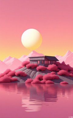 FWG, A serene digital illustration featuring a small, modern house with a flat roof and large windows, situated on a hill overlooking a calm lake. The house is surrounded by vibrant pink trees, creating a striking contrast with the pale pink mountains and a large, glowing sun in the background. The sky is a gradient of soft pinks and oranges, adding to the dreamy atmosphere. The overall color palette is dominated by shades of pink and peach, giving the scene a surreal, almost otherworldly feel. The style is minimalistic and stylized, with smooth lines and soft shading.