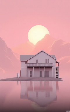 FWG, A serene, dreamlike landscape with a large, white house on stilts, surrounded by a misty, pink-hued lake. The background features pink and peach-colored mountains under a soft, pastel sky with a large, glowing full moon. The scene is peaceful and ethereal, with a subtle, nostalgic atmosphere. The house has a simple, modern design, with a balcony on the second floor. The image is a digital artwork with a soft, painterly style.