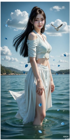 Surreal warm cinematic full body shot photography,Kodak Professional Portra 160,1 girl,looking at viewer,navel,realistic,pose for picture,dynamic posture,good anatomy,real skin texture,4K resolution,perfect figure,depth of field,(1 girl:1.2),very long hair,light smile,looking at viewer,white shirt,white skirt,(flying white chiffon:1.5),bare shoulder,(flying blue petals:1.2),(standing above water surface),sky background,(cloud:1.2),white bird,floating water drops,(white border:1.2),backlight,mupeiling