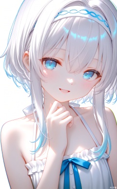 1girl,solo,blue_eyes,looking_at_viewer,white_hairband,smile,bare_shoulders,hairband,hair_between_eyes,white_hair,closed_mouth,short_hair_with_long_locks,dress,portrait,upper_body,long_hair,halterneck,white_dress,hand_up,