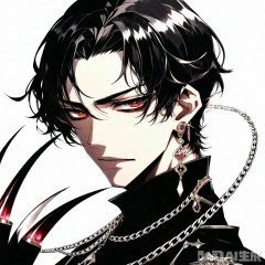 qzfp, 1boy, black hair, male focus, chain, solo, jewelry, earrings, red eyes, cape, short hair, upper body, claws