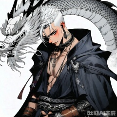 qzfp,choker, 1boy, tattoos, male focus, nose ring, alone, white hair, leather gloves, dragon, edgy, collar up, hair over forehead, shaved head, wielding, scar, brown gloves, bangle, cloak, clip-on earrings, mid body