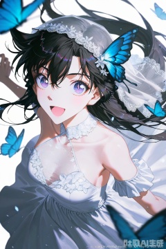 masterpiece,best quality,amazing quality, 1girl,solo,breasts,looking at viewer,smile,open mouth,bangs,simple background,hair ornament,white background,dress,hair between eyes,bare shoulders,black hair,long hair,purple eyes,:d,white dress,bug,butterfly,veil,butterfly hair ornament,blue butterfly, depth of field,light particles,lens flare,(artist:quasarcake:0.8),extreme aesthetic,(wlop:0.6),wanke,rella,wanke,masterpiece,best quality,good quality,newest,year 2024,year 2023,very aesthetic,absurdres,Visual impact,Electromotive force,perspective composition,A shot with tension,ultra-high resolution,32K UHD,sharp focus,best quality,masterpiece,Emotionalization masterpiece,unconventional supreme,masterful details,with a high end texture,in the style of fashion photography,(Visual impact:1.2),giving the poster a dynamic and visually striking appearance,impactful picture,official art,colorful,splash of color,movie perspective,masterpiece,best quality,amazing quality,very aesthetic,absurdres,best quality,newest,translation to Chinese,,maolilan