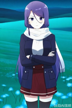 1girl, solo, long hair, looking at viewer,  skirt, very long hair, purple eyes, jacket, purple hair, braid, scarf, side braid, white scarf,