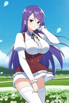 Thigh exposed,thighhighs,looking at viewer,in a meadow,in a meadow,
