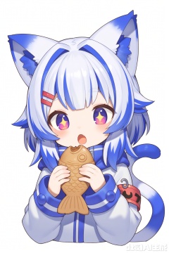 + +, 1girl, :o, animal ears, armband, blue hair, blush, cat ears, cat girl, cat tail, cropped torso, fang, food, hair intakes, hair ornament, hairclip, holding, holding food, jacket, kemonomimi mode, multicolored hair, open mouth, purple eyes, safety pin, sidelocks, simple background, solo, tail, taiyaki, two-tone hair, upper body, virtual youtuber, wagashi, white background, white hair, white jacket
