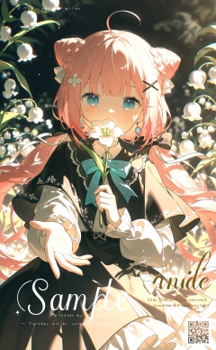 1girl,blue eyes,pink hair,cat,flower,holding flower,solo,hair bun,long hair,white cat,blush,looking at viewer,hair ornament,holding,long sleeves,ahoge,twintails,dress,bow,x hair ornament,white flower,frilled sleeves,double bun,reaching,sidelocks,virtual youtuber,bowtie,reaching towards viewer,hair bow,frills,chromatic aberration,watermark,white bow,ribbon,black dress,white dress,outstretched hand,blunt bangs,blurry background,jewelry,capelet,artist name,english text,low twintails,blue bow,hairclip,skirt,blurry,plant,cowboy shot,earrings,puffy long sleeves,black capelet,open hand,lily of the valley,sample watermark,black bow,twitter username,hair ribbon,braid,black skirt,belt,2023,covering own mouth,outstretched arm,blue bowtie,hair flower,frilled dress,puffy sleeves,covered mouth,collared dress,blonde hair,white ribbon,qr code,