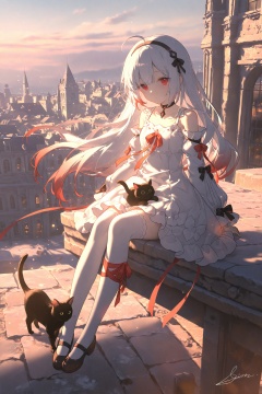 1girl,solo,long hair,looking at viewer,bangs,red eyes,thighhighs,long sleeves,dress,ribbon,bare shoulders,sitting,ahoge,white hair,multicolored hair,hairband,outdoors,detached sleeves,choker,signature,white dress,white thighhighs,cat,building,scenery,leg ribbon,
