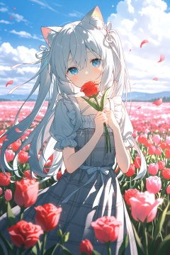 1girl,solo,animal ears,flower,short sleeves,puffy short sleeves,tulip,puffy sleeves,blue eyes,dress,outdoors,smile,plaid dress,holding flower,long hair,blush,sky,red flower,day,hair between eyes,grey hair,holding,plaid,closed mouth,petals,very long hair,cloud,blue sky,bow,depth of field,hand up,hair bow,blurry,grey dress,cat ears,two side up,hair ribbon,pink flower,white bow,field,ribbon,white ribbon,cloudy sky,flower field,blurry foreground,multicolored hair,looking at viewer,criss-cross halter,signature,halterneck,frills,blurry background,white dress,two-tone hair,standing,rose,animal ear fluff,white hair,collarbone,hugging object,cat girl,hands up,head tilt,heart,looking to the side,red rose,