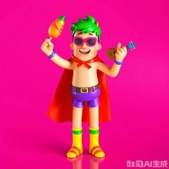 GGXR, A digital 3D cartoon character with spiky green hair, wearing a bright red superhero cape, purple shorts, and mismatched yellow and green socks, holding a giant lollipop in one hand and a tiny ukulele in the other, grinning widely and giving a thumbs-up with the free hand. The character sports large, round pink sunglasses. The background is a vibrant, solid magenta color. The character has a mischievous and lively stance.