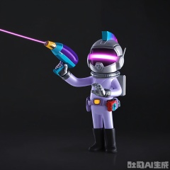 GGXR, A digital 3D cartoon character with a mohawk of rainbow-colored hair, wearing a purple and silver spacesuit with a helmet, black boots with rocket boosters, and a utility belt, holding a laser blaster in one hand and a crystal in the other, looking determined and floating in "space" (in a still image) with the free hand. The character has a glowing visor on the helmet. The background is a deep, solid black color with stars and galaxies. The character has a sci-fi and adventurous stance.