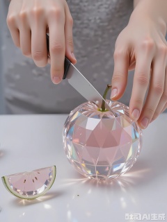QSG, A photograph of a pair of hands carefully slicing a large, faceted crystal watermelon with a precision tool. The crystal watermelon shimmers, casting prismatic reflections. The hands are steady, with well-groomed fingers. The background is a minimalist, light gray surface. The focus is on the crystal fruit and the hands, with a soft bokeh effect blurring the surroundings. The image has a crisp, modern aesthetic.