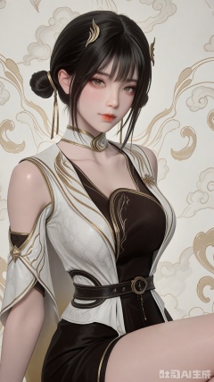 general, sfw, Solid Glossy and cloud background, 1woman, solo, breast, exquisite skin, looking at viewer, sitting, very awa, masterpiece, best quality, highres, absurdres, newest, aesthetic,