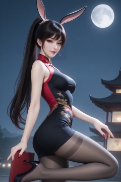 <lora:xiaowu_sl_v8-000012:0.7>,xiaowu_sl,1girl,solo,animal ears,rabbit ears,long hair,(white_skin:1.2),brown hair,black hair,closed mouth,medium breasts,shiny,pale skin,lips,lipstick,big eyes,eyelashes,long eyelashes,makeup,eyeshadow,high ponytail,nail polish,masterpiece,high quality,highres,absurdres,best quality,8K,high-res detailed,cheongsam,black cheongsam,(loose clothes:1.2),skirt,chiffon_skirt,shorts_under_skirt,puffy_shorts,looking at viewer,standing,dynamic pose,seductive smile,night sky,[moon],star \(sky\),chinese style architecture,lantern,<lora:sh-glossy_r2:0.7>,pantyhose,thighband_pantyhose,shiny legwear,high heels,louboutin heels,black heels,red bottom heels,footwear,<lora:Louboutin_Heels__PONY:0.5>,<lora:HandFixer_pdxl_Incrs_v1:0.5>,handfixer,<lora:DetailedEyes_V3:0.5>,