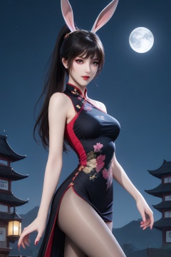 <lora:xiaowu_sl_v8-000012:0.7>,xiaowu_sl,1girl,solo,animal ears,rabbit ears,long hair,(white_skin:1.2),brown hair,black hair,closed mouth,medium breasts,shiny,pale skin,lips,lipstick,big eyes,eyelashes,long eyelashes,makeup,eyeshadow,high ponytail,nail polish,masterpiece,high quality,highres,absurdres,best quality,8K,high-res detailed,cheongsam,black cheongsam,(loose clothes:1.2),skirt,chiffon_skirt,shorts_under_skirt,puffy_shorts,looking at viewer,standing,dynamic pose,seductive smile,night sky,[moon],star \(sky\),chinese style architecture,lantern,<lora:sh-glossy_r2:0.7>,pantyhose,thighband_pantyhose,shiny legwear,high heels,louboutin heels,black heels,red bottom heels,footwear,<lora:Louboutin_Heels__PONY:0.5>,<lora:HandFixer_pdxl_Incrs_v1:0.5>,handfixer,<lora:DetailedEyes_V3:0.5>,