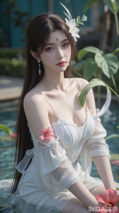 1girl, solo, long hair, breasts, looking at viewer, blush, open mouth, bangs, brown hair, hair ornament, dress, bare shoulders, brown eyes, medium breasts, collarbone, flower, parted lips, hair flower, water, white dress, sleeveless dress, leaf, plant, red flower, partially submerged, hibiscus