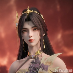 A stunning, digital fantasy art portrait of a young woman with porcelain skin and long, straight black hair. She wears a golden, ornate crown with intricate designs and matching earrings. Her eyes are large and expressive, with a hint of melancholy. She has full, red lips and a delicate, symmetrical face. The background is a blurred, warm gradient, suggesting a sunset or sunrise. The style is realistic with a touch of fantasy, emphasizing elegance and ethereal beauty. The lighting is soft and warm, highlighting her features and creating a serene, almost otherworldly atmosphere.