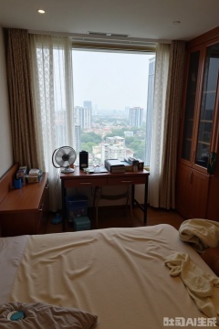 The image shows a bedroom with a bed in the foreground, which has a beige blanket and a bag on it. There is a wooden headboard and a wooden desk with a chair in the background. On the desk, there are some books and a blue container. A fan is placed on the floor near the window, which has curtains with a patterned design. Outside the window, a view of a cityscape with tall buildings is visible. There is also a wooden cabinet with glass doors on the right side of the room. The room appears to be well-lit by natural light coming through the window.Life